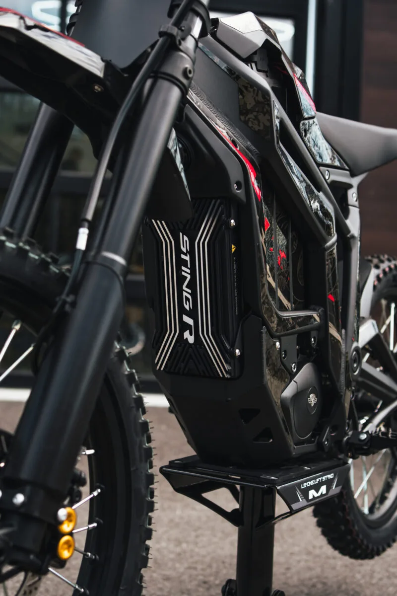 Kad atlaikytų didesnius poreikius, Sting R Pro aprūpintas talpia 72 V 40 Ah ličio jonų baterija. Ši galinga baterija suteikia motociklui įspūdingą iki ~100 km nuvažiuojamą atstumą vienu įkrovimu (priklausomai nuo važiavimo sąlygų). Nepaisant didelės talpos baterijos, dėl lengvo lydinio rėmo bendras motociklo svoris tėra apie 76 kg, todėl Sting R Pro išlieka vikrus ir manevringas. Dar vienas privalumas – greitas įkrovimas: moderni įkrovimo sistema leidžia bateriją visiškai įkrauti maždaug per 3 valandas. Tai reiškia, kad daugiau laiko galėsite praleisti važiuodami trasoje, o ne laukdami, kol įkraus akumuliatorius. Be to, įdiegta regeneracinio stabdymo technologija padeda efektyviau panaudoti energiją ir šiek tiek pratęsti nuotolį kiekvieno stabdymo metu.